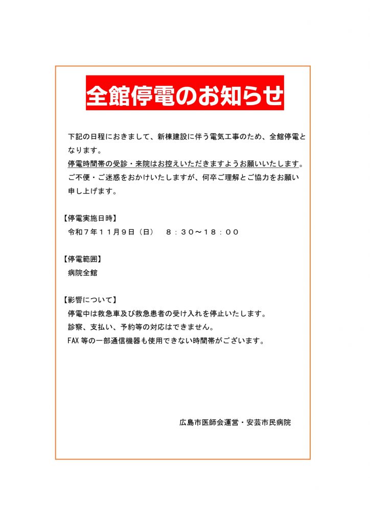 新棟建設に伴う電気工事のため全館停電となります。患者様およびご来院の皆様には大変ご不便、ご迷惑をおかけいたしますことを深くお詫び申し上げます。詳細は、下記のお知らせをご確認ください。